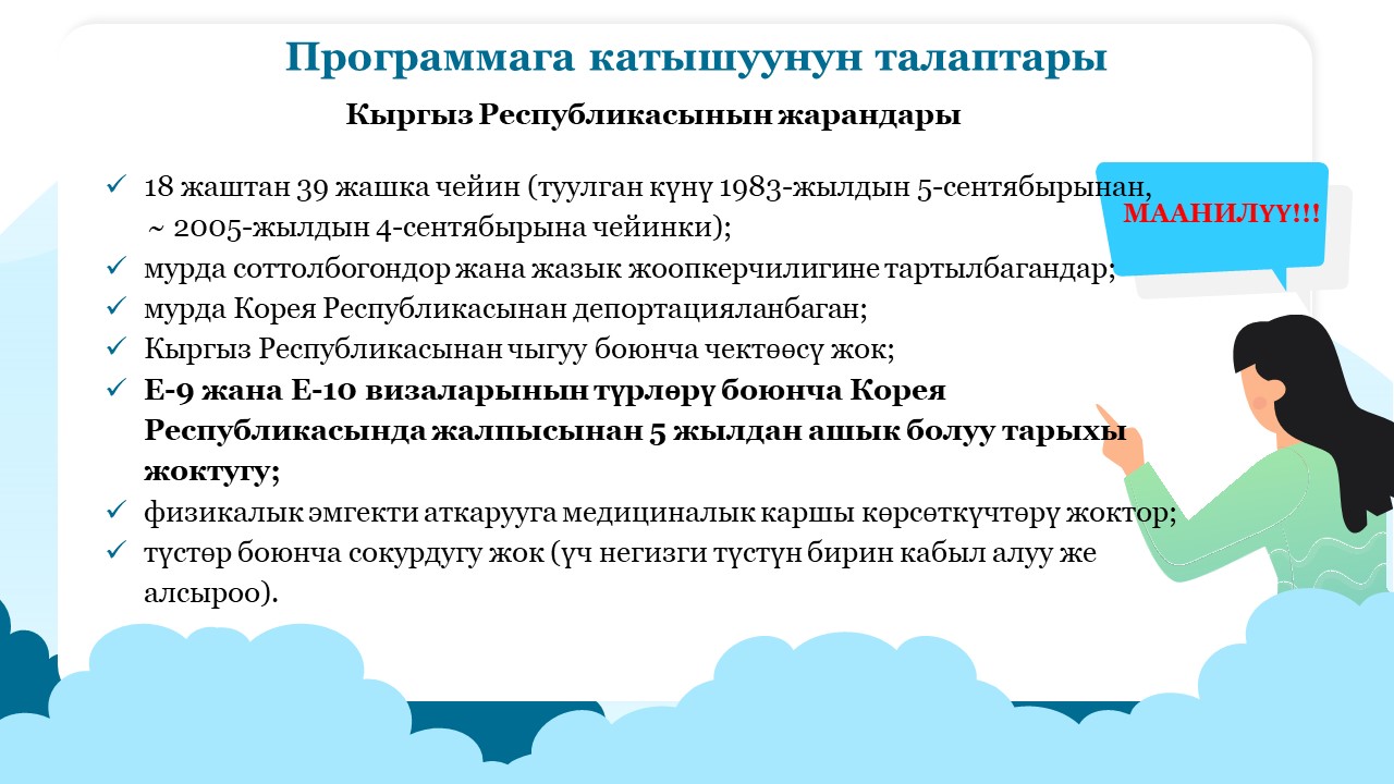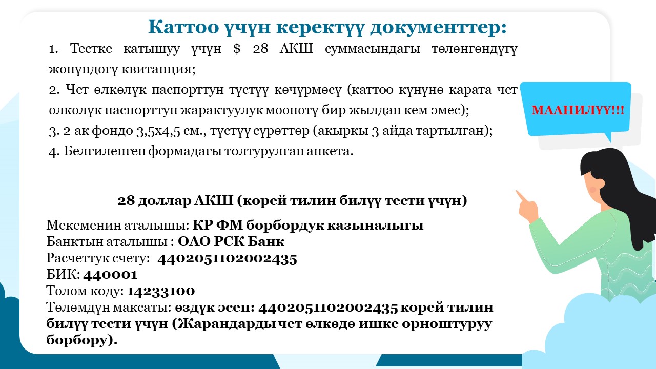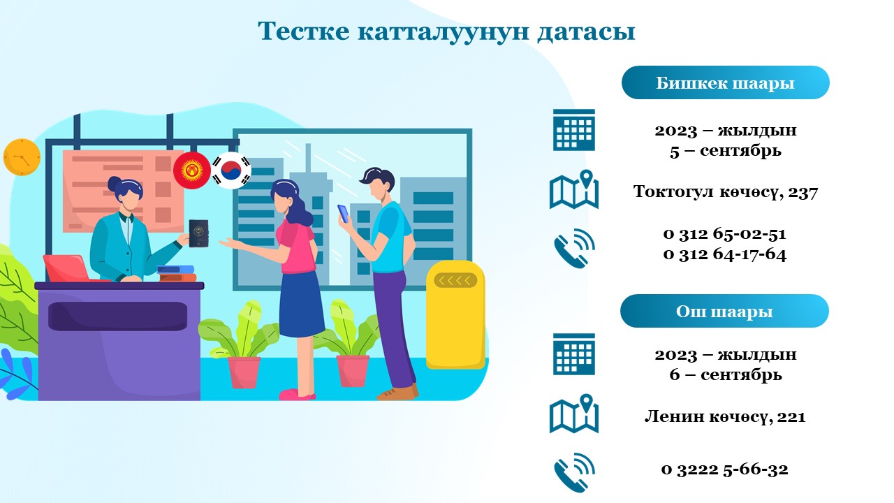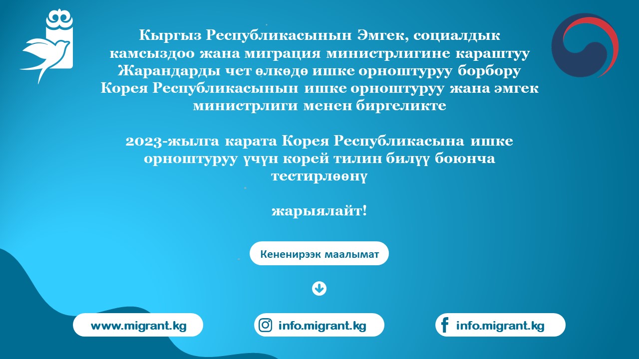 - Корея Республикасында 2023-жылга жумушка орношуу үчүн корей тилин билүү боюнча биринчи атайын тесттен өтүү жөнүндө жарыя! /